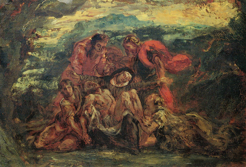 El grupo está escalonado y dispuesto por entero sobre un fondo de un verde oscuro y uniforme, que se asemeja tanto a los amasijos de rocas como a un mar batido por la tormenta. Ese fondo es de una simplicidad fantástica, y E. Delacroix sin duda, como Miguel Ángel, ha suprimido lo accesorio para no perjudicar la claridad de la idea. Esta obra maestra deja en el espíritu un profundo surco de melancolía”.