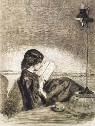 “El pintor y grabador James Abbott McNeill Whistler, que nació en Estados Unidos, trabajó en Londres y se sintió parisino, tenía la costumbre de dar a sus cuadros un título según la tonalidad dominante: Nocturno en azul y oro: Valparaíso; Arreglo en gris y azul N.° 1 (Retrato de la madre del artista), o simplemente Venecia en azul turquesa, Amsterdam en topacio, Bretaña en ópalo. A propósito de estas últimas obras, Marcel Proust escribió que las mismas lo habían llevado a un estado de nerviosidad indescriptible, algo que jamás habían conseguido las obras de Manet o de Degas. El mismo Whistler encontraba a los impresionistas demasiado realistas; pensaba que los simbolistas eran más modernos. En cambio, el artista dio a sus numerosos huecograbados títulos realmente prosaicos. Lectura a la luz de una lámpara muestra a una mujer joven de perfil, a la luz de una lámpara de petróleo, con una taza de café o de té a su lado, leyendo un libro que sostiene con angustia muy cerca de sus ojos. Dado que la lámpara produce aparentemente luz suficiente para leer, la única hipótesis que se puede extraer es que la joven está aquejada de una fuerte miopía. O es posible que sólo esté muy concentrada y quiera la menor distancia posible entre ella y su libro. La lectora y el libro se funden, nada se interpone entre ellos. Una silla cómoda, luz y una lectura apasionante son suficientes para la pequeña felicidad de esta lectora”.