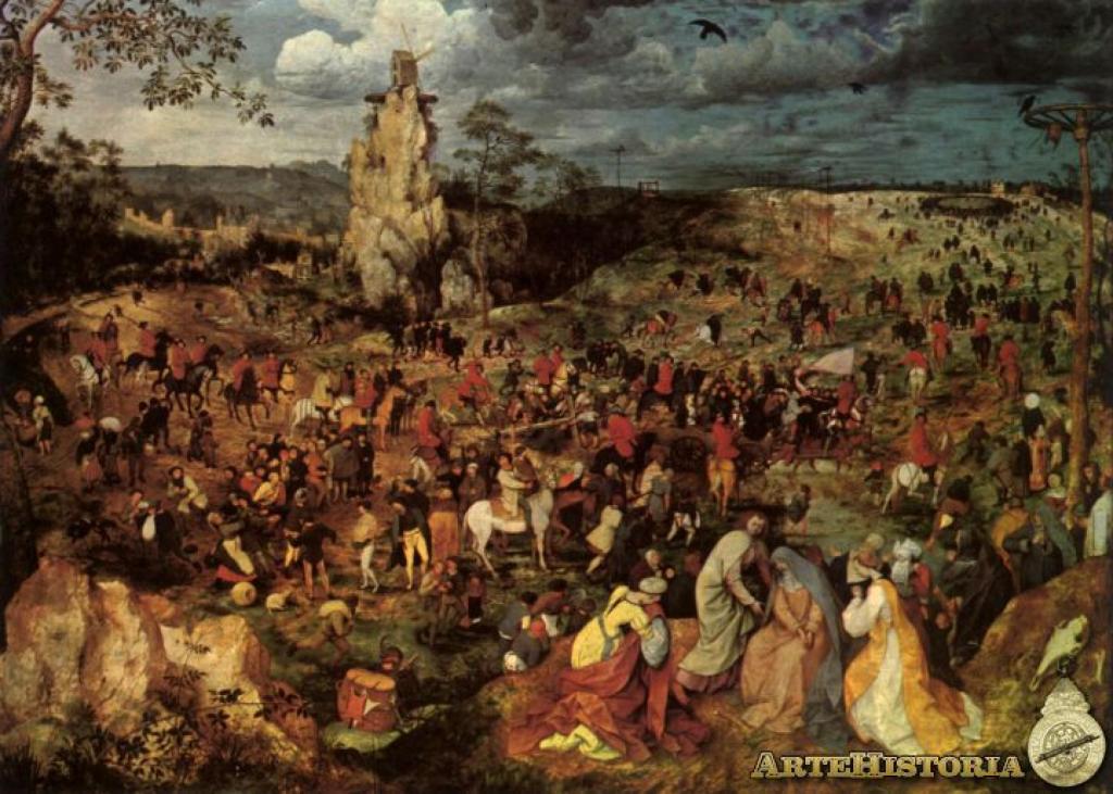 “Pero de todos los cuadros de Brueghel el que más invita a la reflexión no es propiamente alegórico ni sistemático. El Camino del Calvario es uno de sus lienzos de mayor tamaño, atestado de pequeñas figuras rítmicamente distribuidas sobre un vasto y romántico paisaje. La composición es sencilla, agradable en sí misma y parece surgir de la misma escena en lugar de serle impuesta.
