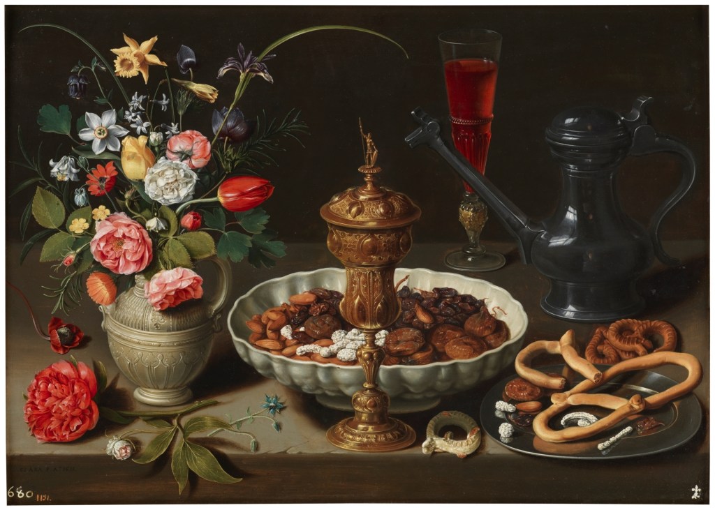 En Bodegón con flores, copa de plata dorada, almendras, frutos secos, dulces, panecillos, vino y jarra de peltre, Clara Peeters “por medio de los contornos precisos y los efectos lumínicos sutiles, logra una apariencia realista con unas flores cuidadosamente representadas que recuerdan a las primeras ilustraciones científicas. En la jarra de peltre pueden apreciarse unos minúsculos autorretratos”.