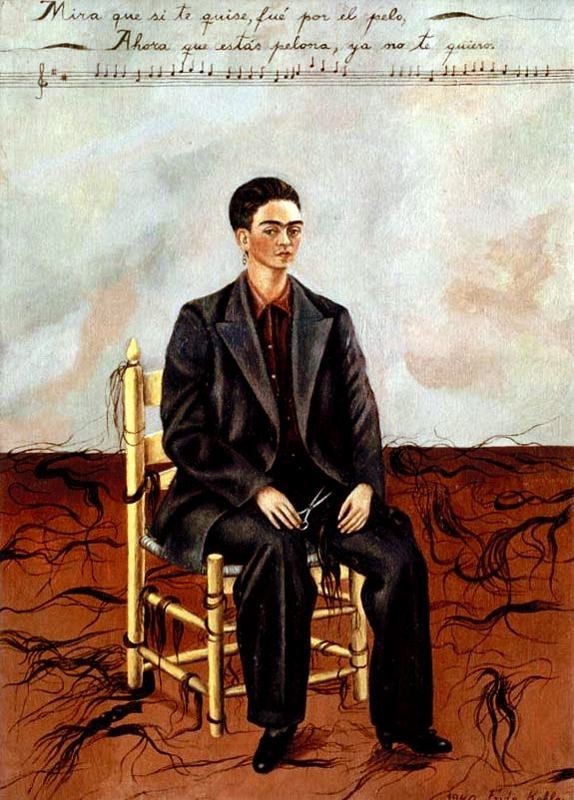 En lugar de sus atuendos habituales, la Frida de la pintura llevaba un amplio traje muy similar a los que, de vez en cuando, usaba Diego. Las ropas eran oscuras, casi negras; una camisa marrón, abotonada hasta el cuello, no dejaba ver ni un centímetro de su pecho. Todo lo femenino etaba anulado. El cabello no estaba en la cabeza. Los mechones largos, desparramados a su alrededor, y entre las manos una tijera y una trenza.