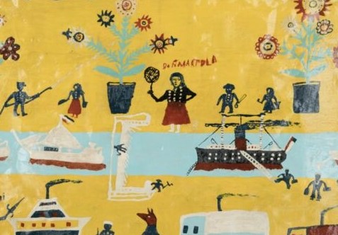 En ‘Doña Bartola’, “el espacio se parcela en alargadas bandas horizontales, permitiendo que el hondo sentido ornamental del artista se manifieste especialmente. Figurillas en serie animan cada franja, a través de escenas de puerto y sus no individualizables marinos, los barcos en el agua, unas pocas casas y arbolitos en maceteros, en su totalidad mostrado de modo frontal…