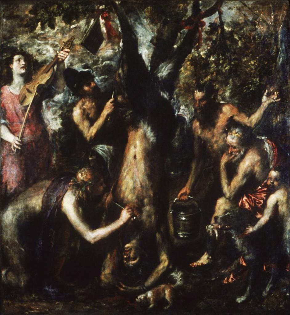 “Por un pecado similar, Aracné había sido castigada, pero Marsias era un sátiro silvestre que vivía al margen de todo, y no tuvo mejor idea que desafiar a Apolo en un concurso de música. El Desollamiento de Marsias es extremo, expresionista, una masa incoherente en una gama de colores apagada y luces borrosas. Marsias cuelga patas para arriba, se ven sus venas en red, la transparencia borravina de las vísceras y tendones al descubierto. La habilidad de Tiziano en esta última época para transmitir estrés psicológico y físico es única: el tirón de Marsias duele. Tiziano puede hacer eso, hacerte sentir que la tela y tu piel son la misma membrana celular. ‘¿Por qué me arrancas de mí?’, exclama el sátiro mientras lo desuellan. ‘Por tu arrogancia desmedida’, le contestan los dioses”.