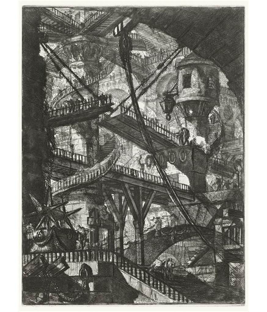 El artista logra convencernos de que esta sala desmesurada está, por lo demás, cerrada herméticamente, incluso por la cara del rectángulo que no veremos nunca por hallarse situada detrás de nosotros. En los pocos casos (planchas II, IV y IX) en que una impracticable salida se abre sobre un exterior a su vez cerrado por cuatro paredes, esta especie de «trompe l’oeil» no hace sino agravar, en el centro de la imagen, la pesadilla del espacio cerrado. La imposibilidad de discernir un plan de conjunto añade un nuevo elemento al malestar que nos causan las Prisiones: casi nunca tenemos la impresión de estar en el eje del edificio, sino únicamente en un radio vector; la preferencia del barroco por las perspectivas diagonales acaba por darnos aquí la sensación de existir en un universo asimétrico. Pero ese mundo privado de centro es, al mismo tiempo, perpetuamente expansible. Detrás de esas salas cuyos tragaluces se hallan cerrados por rejas, sospechamos que existen otras salas todas iguales, deducidas o que deben deducirse indefinidamente en todas las direcciones imaginables. Las leves pasarelas, los aéreos puentes levadizos que se añaden casi por todas partes a galerías y escaleras de piedra, parecen responder a la misma preocupación de lanzar al espacio todas las curvas y todas las paralelas posibles. Este mundo cerrado sobre sí mismo es matemáticamente infinito …