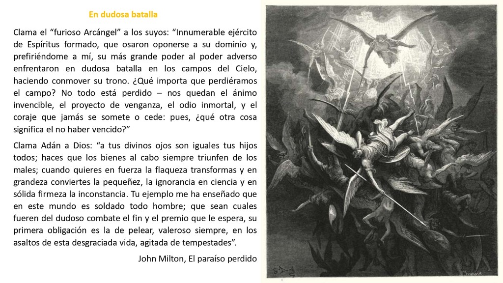 Clama el “furioso Arcángel” a los suyos: “Innumerable ejército de Espíritus formado, que osaron oponerse a su dominio y, prefiriéndome a mí, su más grande poder al poder adverso enfrentaron en dudosa batalla en los campos del Cielo, haciendo conmover su trono. ¿Qué importa que perdiéramos el campo? No todo está perdido – nos quedan el ánimo invencible, el proyecto de venganza, el odio inmortal, y el coraje que jamás se somete o cede: pues, ¿qué otra cosa significa el no haber vencido?”