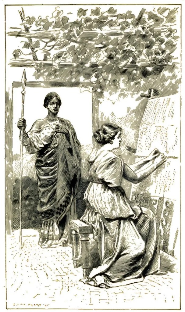 Ariadna fue abandonada por Teseo en Naxos, la isla del dios Dioniso. Allí, por él protegida pero sola, retomó su arte del tejido.