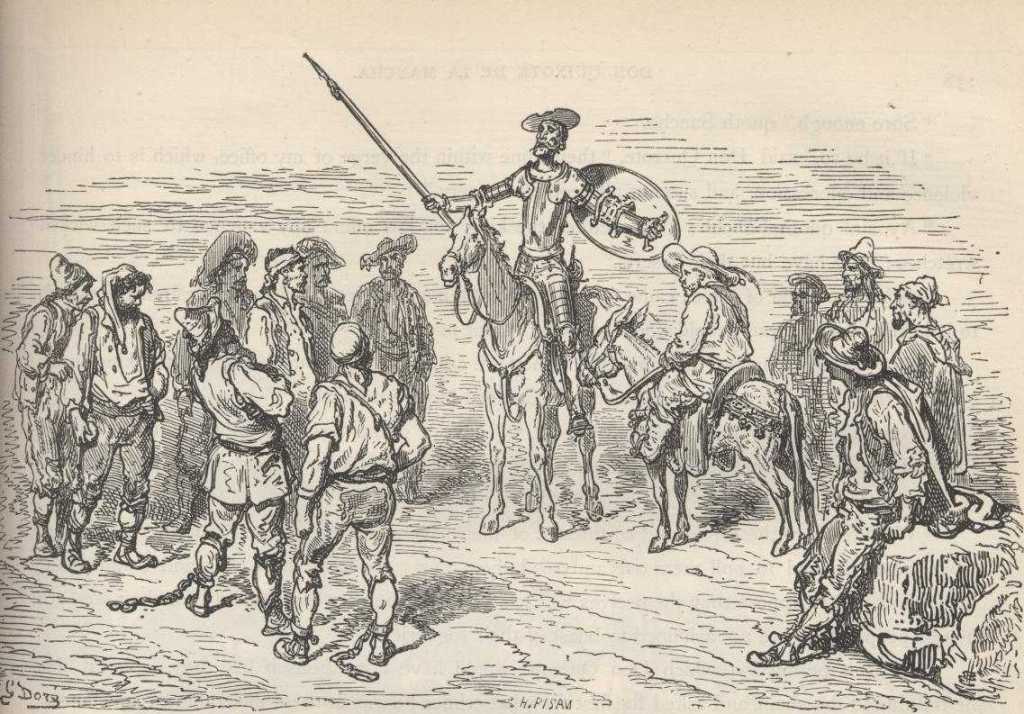 —De todo cuanto me habéis dicho, hermanos carísimos, he sacado en limpio que, aunque os han castigado por vuestras culpas, las penas que vais a padecer no os dan mucho gusto y que vais a ellas muy de mala gana y muy contra vuestra voluntad, y que podría ser que el poco ánimo que aquel tuvo en el tormento, la falta de dineros deste, el poco favor del otro y, finalmente, el torcido juicio del juez, hubiese sido causa de vuestra perdición y de no haber salido con la justicia que de vuestra parte teníades. Todo lo cual se me representa a mí ahora en la memoria, de manera que me está diciendo, persuadiendo y aun forzando que muestre con vosotros el efeto para que el cielo me arrojó al mundo y me hizo profesar en él la orden de caballería que profeso, y el voto que en ella hice de favorecer a los menesterosos y opresos de los mayores. Pero, porque sé que una de las partes de la prudencia es que lo que se puede hacer por bien no se haga por mal, quiero rogar a estos señores guardianes y comisario sean servidos de desataros y dejaros ir en paz, que no faltarán otros que sirvan al rey en mejores ocasiones, porque me parece duro caso hacer esclavos a los que Dios y naturaleza hizo libres. Cuanto más, señores guardas —añadió don Quijote—, que estos pobres no han cometido nada contra vosotros. Allá se lo haya cada uno con su pecado; Dios hay en el cielo, que no se descuida de castigar al malo ni de premiar al bueno, y no es bien que los hombres honrados sean verdugos de los otros hombres, no yéndoles nada en ello. Pido esto con esta mansedumbre y sosiego, porque tenga, si lo cumplís, algo que agradeceros; y cuando de grado no lo hagáis, esta lanza y esta espada, con el valor de mi brazo, harán que lo hagáis por fuerza.
