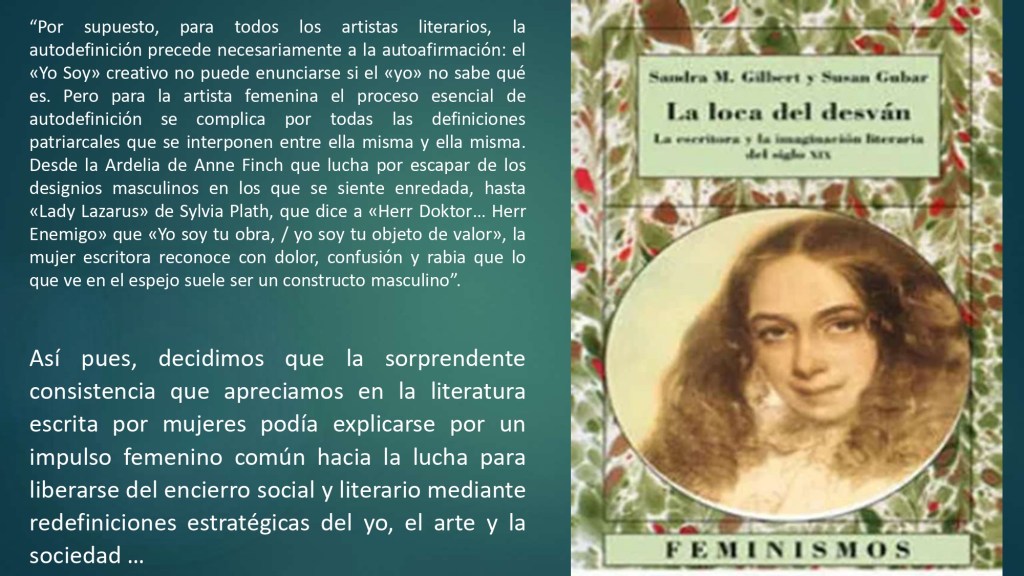 «Así pues, decidimos que la sorprendente consistencia que apreciamos en la literatura escrita por mujeres podía explicarse por un impulso femenino común hacia la lucha para liberarse del encierro social y literario mediante redefiniciones estratégicas del yo, el arte y la sociedad».